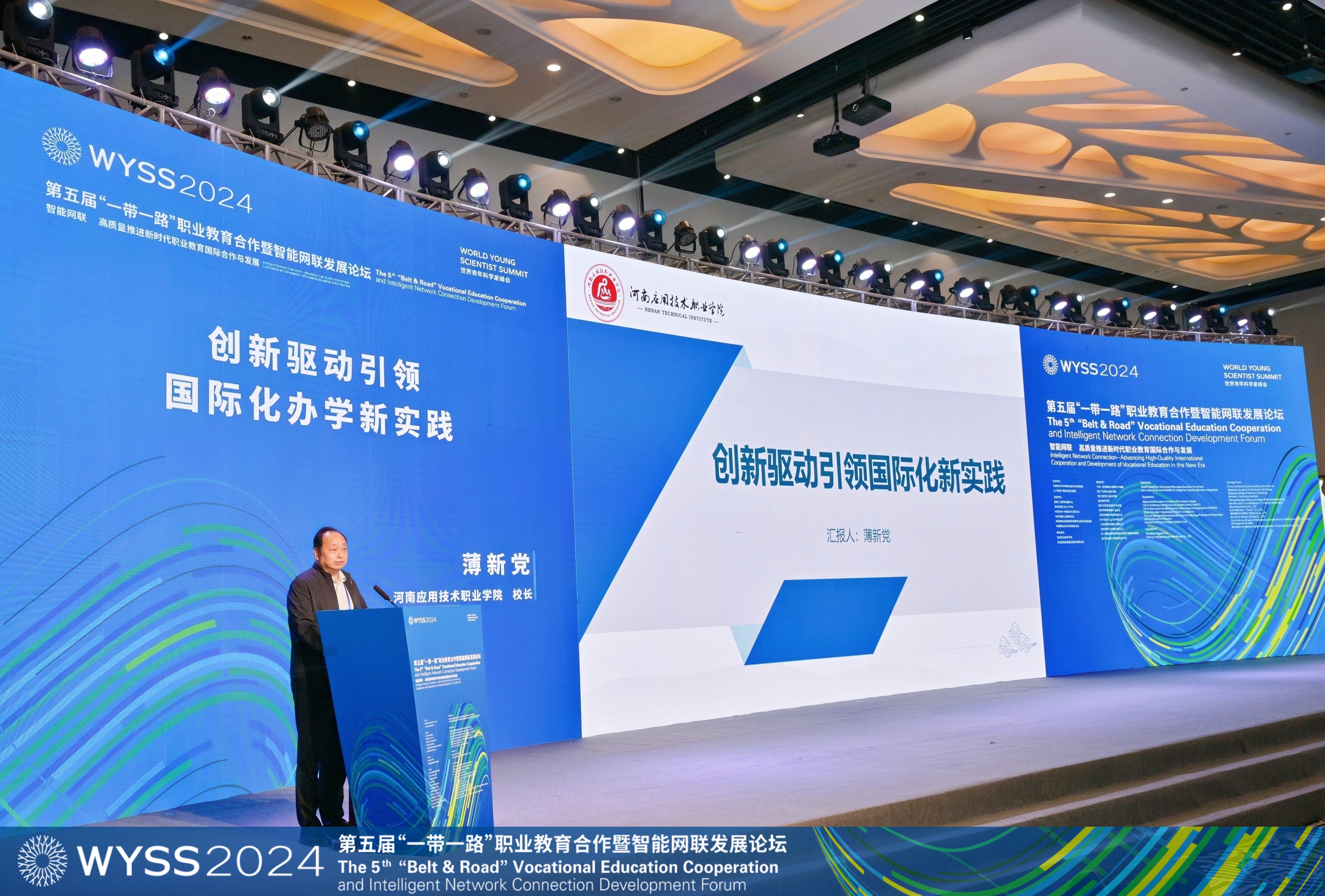 薄新党以《创新驱动引领国际化办学新实践》为题作专题报告。他分享了学校近年来在教育国际合作领域的显著成果和典型经验,重点介绍学校在国际化合作模式探索、管理体制、保障机制等方面的工作思路与特色举措。在中外院校合作交流洽谈环节,薄新党与柬埔寨劳动与职业培训部技术职业教育与培训总局相关领导进行深入交流和合作洽谈,他表示,学校将继续深化与共建“一带一路”国家的职业教育合作,拓展国际合作领域,创新合作模式,共同推动职业教育国际化工作高质量开展。